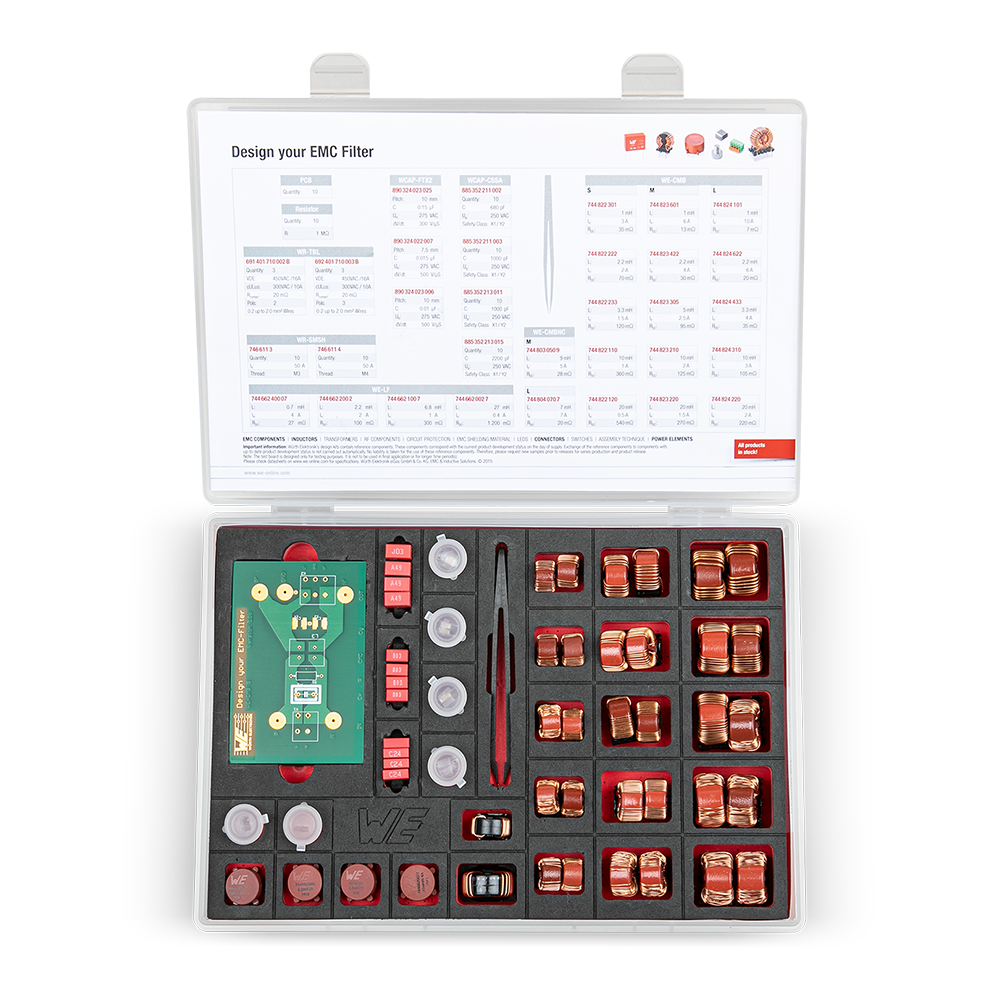 - Dieses Design Kit enthält 10 Testplatinen und eine Auswahl passender Bauteile für den einfachen Aufbau verschiedener Netzfilter.