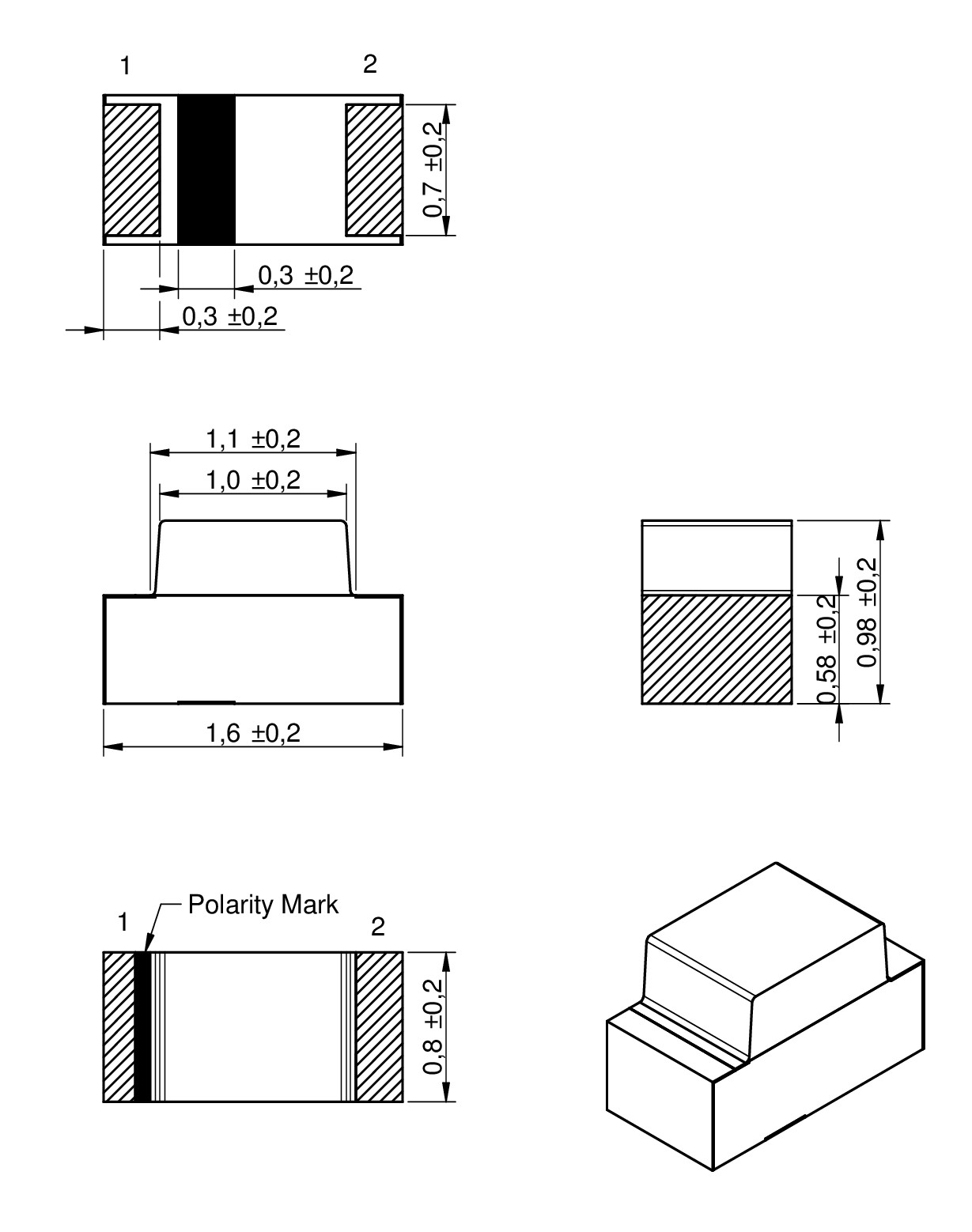 | 0603 Rectangular | 1.6 | 0.98 | 0.8 | SMT | ||