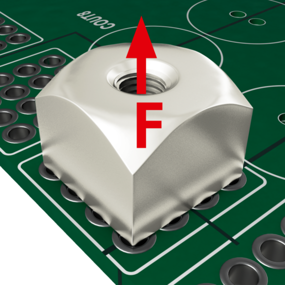 Eine leistungsfähige Einpressverbindung wird hergestellt indem ein Einpresspin in das durchkontaktierte Loch einer Leiterplatte eingepresst wird. Dieser Vorgang erzeugt eine hohe Reibung, die zu einer homogenen Kaltverschweißung an den Anbindungsstellen zwischen Pin und Durchkontaktierung führt. Keine andere Technologie überträgt Ströme bis zu 500 A bei solch geringer Wärmeentwicklung.