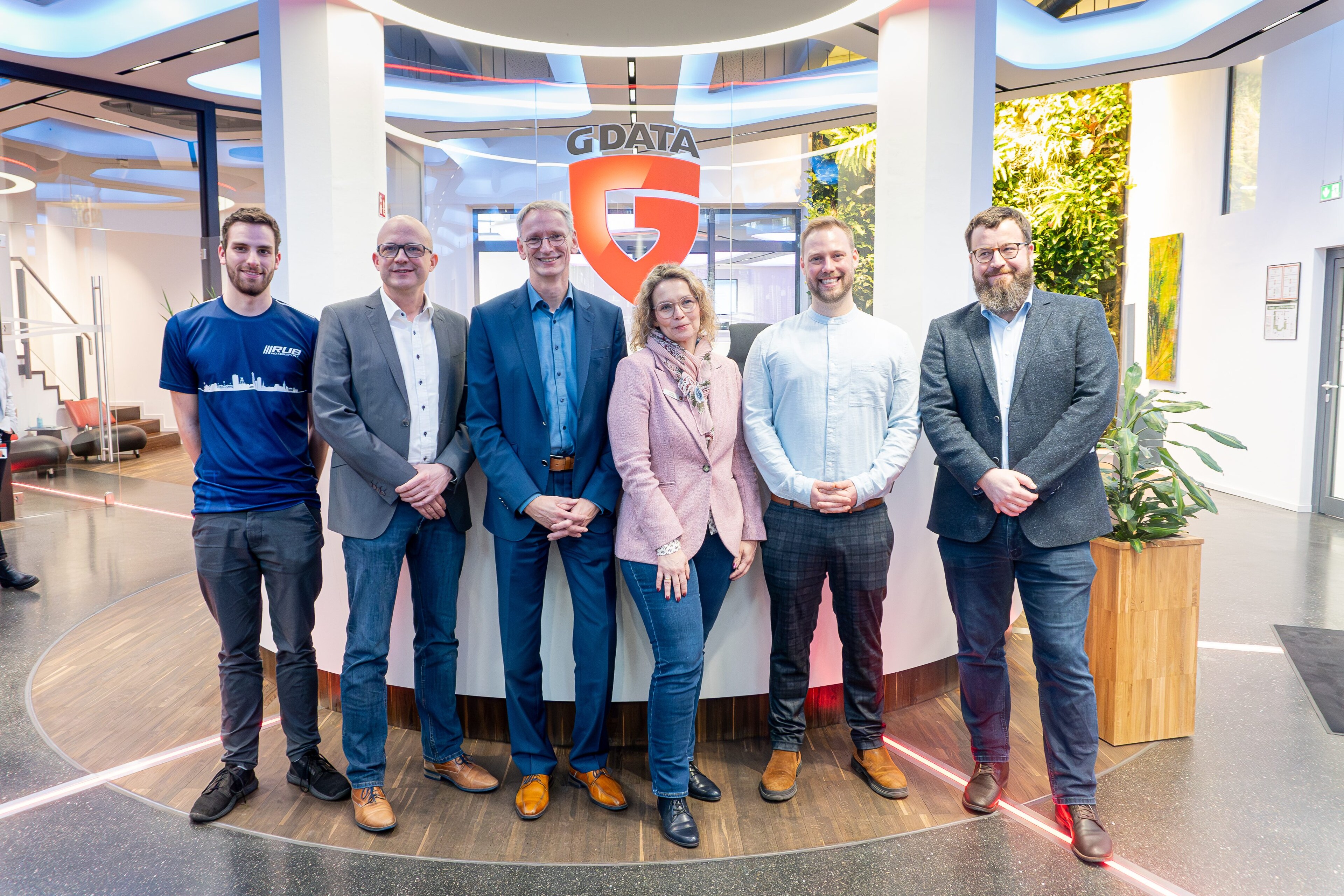 Guests at the opening ceremony of the Würth Elektronik MiniHub (from left to right): Stefan Rohr from the motor sports team at Ruhr University Bochum, Dr.-Ing. Thomas Wollinger, Innovation Manager at Bochum Economic Development, Arnt Stumpf, Management at Würth Elektronik eiSos, Jessika Lüning, Public Affairs and Location Marketing at G DATA CyberDefense AG, Jan-Eric Scholten, Head of People and Organization at Würth Elektronik eiSos, and Jan Speckenbach, Senior Specialist Data Science and contact person for the MiniHub Bochum at Würth Elektronik eiSos.