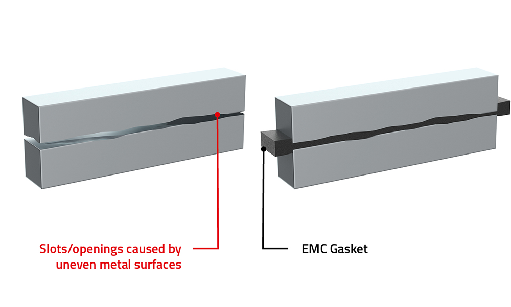 Auch in vollständig metallischen Gehäusen muss es eine Tür oder Klappe geben, um die Elektronik im Inneren zu platzieren. Um die dabei entstehenden kleinen Spalte zu schließen und das Austreten störender Signale zu verhindern, bieten wir EMV-Dichtungen für unterschiedliche Montagebedingungen an.