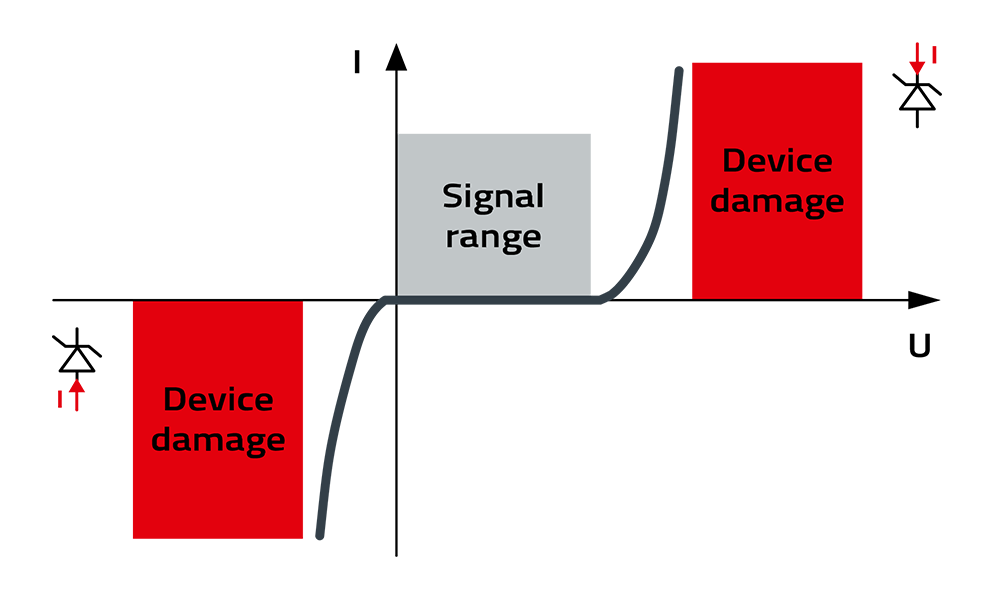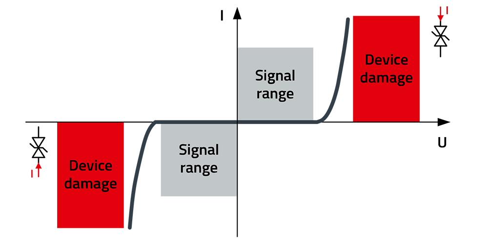 Kennlinie für ein bidirektionales Überspannungsschutzelement: Im normalen Betrieb sollte das Signal in einem der grau gezeichneten Spannungsbereiche bleiben. Steigt die Spannung weiter an (in positiver oder negativer Richtung) werden zunächst Überströme abgeleitet und die Spannung geklemmt, bevor bei noch höherer Überlastung der rote Bereich erreicht wird und das Überspannungsschutzelement Schaden nimmt.