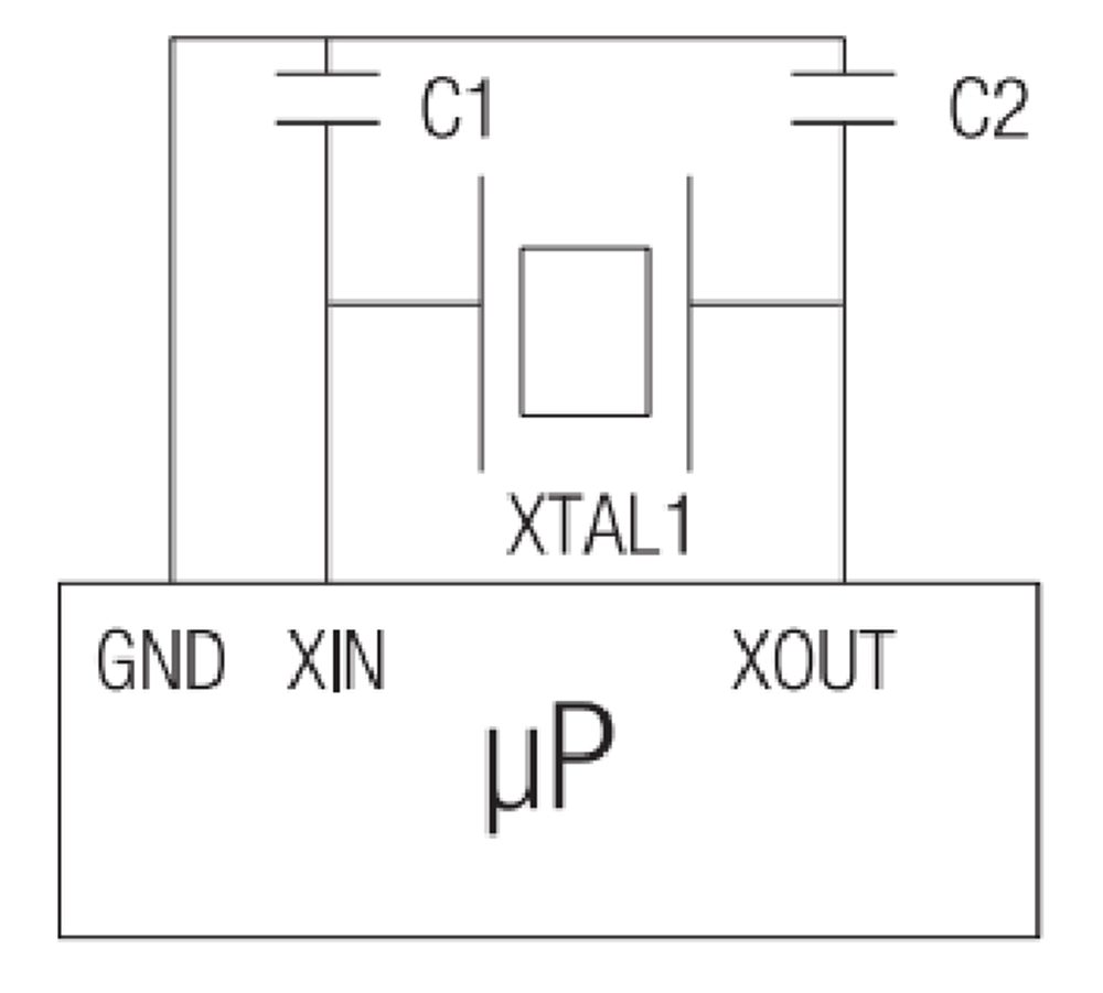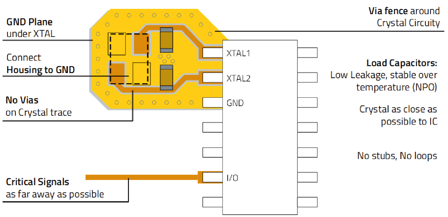 Layoutbetrachtungen zur Realisierung einer Oszillatorschaltung: Die Massefläche sollte unter dem Quarz sein und mit seinem Gehäuse verbunden sein. Keine Vias auf der Leiterbahn zum Quarz unterbringen. Kritische Signale sollten so weit wie möglich entfernt von der Oszillatorschaltung untergebracht werden.