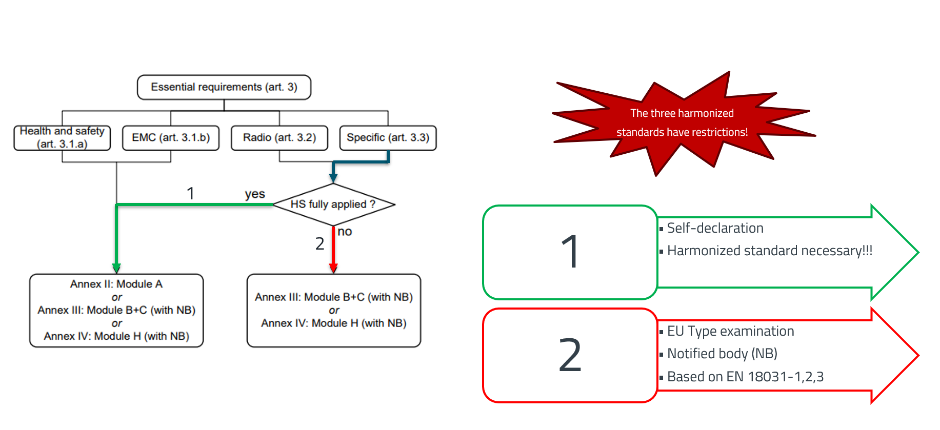 Bild 5. Ob die Prüfung der Konformität eines Produkts in Eigenregie stattfinden kann, ist vom Vorhandensein eines harmonisierten Standards abhängig. Wenn nicht kommen zertifizierte Dienstleister (Notified Bodies) ins Spiel. (Quelle: Europäische Kommission – RED Guide [4])