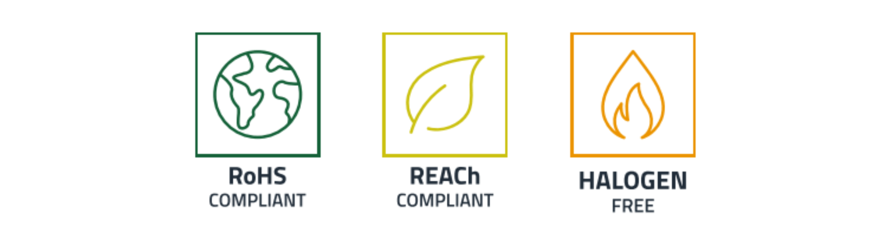 Alle unsere Produkte sind RoHS-konform und durch das grüne Label mit dem Aufdruck Compliant RoHS&REACH und einem grünen Haken auf dem Verpackungslabel gekennzeichnet. Zudem befinden sich in den Datenblättern zusätzliche Icons, um die Konformität nochmal zu bestätigen: