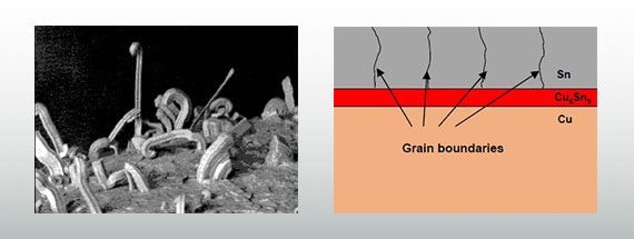 Brechen Whisker, können sie Kurzschlüsse auf der Leiterplatte oder bei Fine-Pitch-Bauteilen verursachen. Zu den größten Herausforderungen zählen jedoch Lichtbögen, die bei hohen Strömen und Spannungen auftreten können. Unter welchen Umständen Whisker genau wachsen, ist bis heute nicht vollständig erforscht. Das Risiko ist aber offenbar dann besonders hoch, wenn eine Kupferoberfläche mit reinem Zinn bedeckt ist.