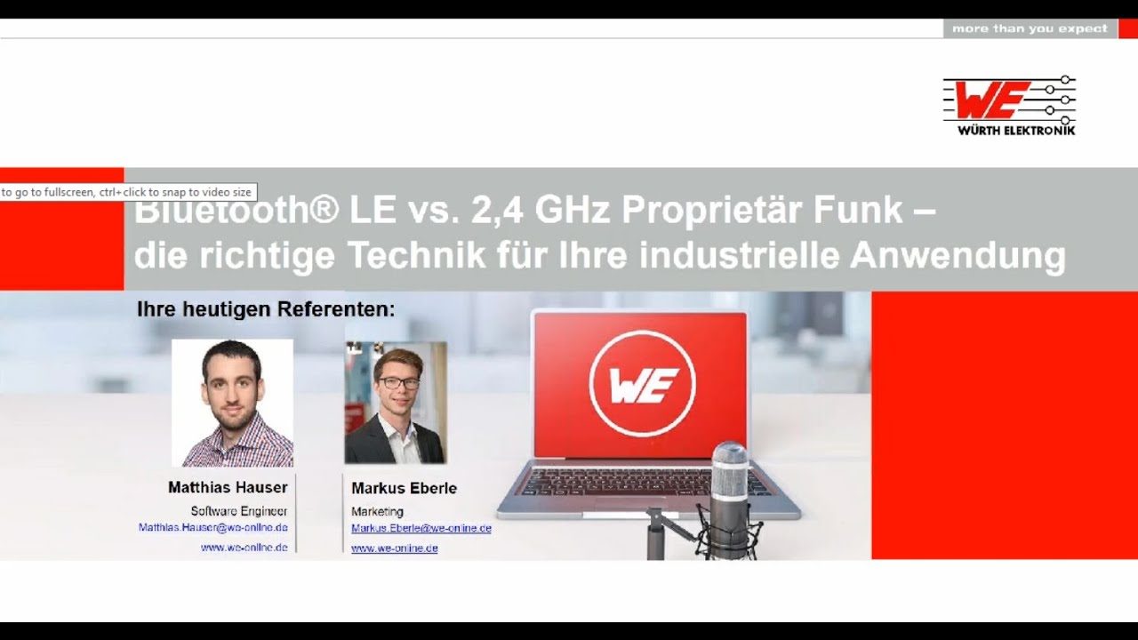 In diesem Webinar präsentieren wir einen Vergleich zwischen proprietärem 2,4 GHz Funk und dem weltweit genutzten Bluetooth® Low Energy Standard. Auf Basis der Eckdaten beider Funklösungen, wollen wir Ihnen helfen, die richtige Wahl für Ihre Anwendung zu treffen. Zusätzlich werden unseren neuen Funkmodule Proteus-III und Thyone-I vorgestellt, sowie deren Integration in Ihre Endanwendung skizziert.