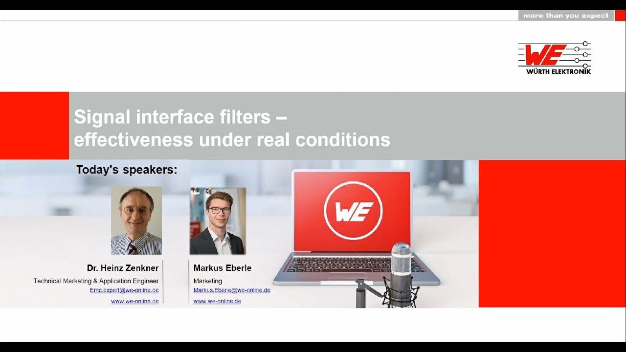 The webinar shows in a holistic concept the challenges that arise, when implementing an RF filter in modern signal interfaces. High signal data rates, different grounding concepts, boundary conditions of the housing, filter insertion loss, transient protection and also the use of modern components are considered. The effectiveness of filters under realistic impedance conditions, via the coupling antenna (= peripheral cable) - antenna, compared to the 50Ohm system is shown. Filter topologies are compared, their effect in the system when using different inductors is shown. The influence of filter design and antenna impedance, i.e. the "peripheral cable", are thus clearly understood. From a short and simple signal analysis, interference spectrum and filter corner frequency can be determined. Decisive for the required function of a filter are the topology adapted to the system, components suitable for the frequency range and an RF-compatible design including layout. This is followed by selection of the suitable inductance with adapted curve (u`, u``), and, if necessary, additional transient protection. Associated components are briefly discussed.