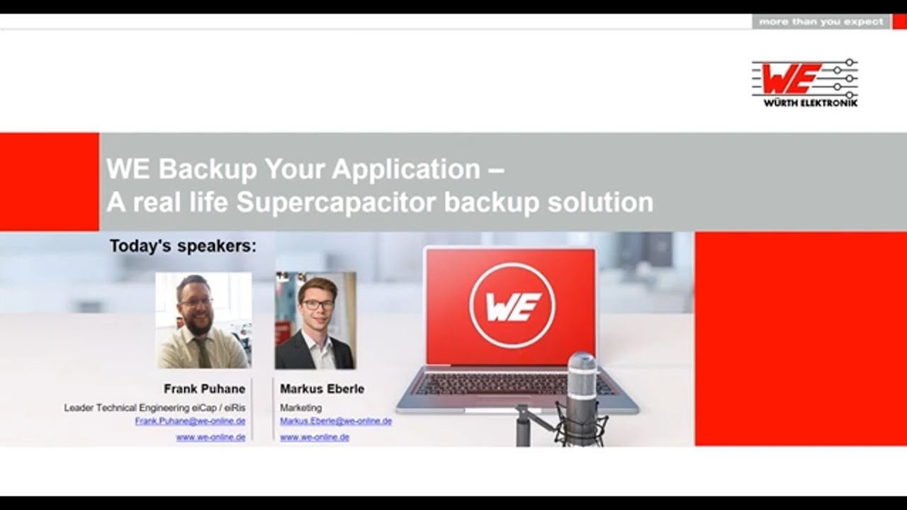 If the power supply of the application breaks down, this is not a pleasant situation. Würth Elektronik eiSos built up a demonstration, which shows a hot swappable backup solution with a size of 10 cm x 18.5 cm (3.94 inch x 7.3 inch). The input voltage is 24V and the backup output voltage is 12 V for a normal industrial power rail application. The available output power is 30 W (12 V @ 2.5 A). We also talk about the classification of Supercapacitors, the model parameters and performance and of course the charge-, discharge and frequency behavior. We have different tools to support your design-in process. For example the Support Note SN009, the Application Note ANP077 and currently we working on a Supercapacitor bank calculation tool. WE support you in your Design. For the power stage, we used the software for and from the LTC3351 from Analog Devices