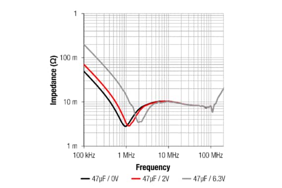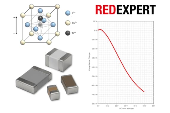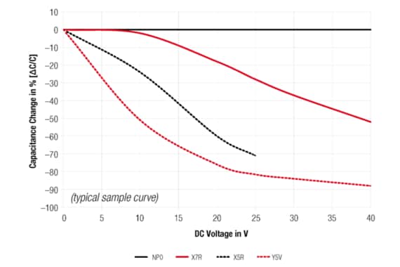 Class 2 ceramic capacitors (X7R, X5R, X6S, ...) show a strong dependence of their capacitance in relation to the applied voltage. This effect varies depending on the component, with capacitance changes of over 80% possible in some cases.