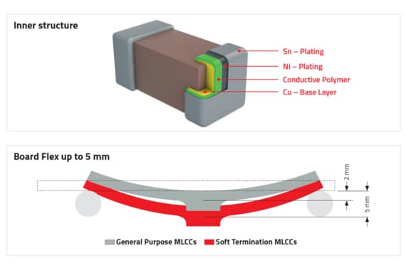 - Use special soft termination MLCCs (series: WCAP-CSST). These components have a highly conductive polymer layer in the termination layer that can compensate for certain mechanical loads.