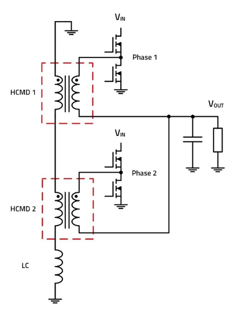 This complex topology requires a certain kind of power inductor specially designed for it. WE-HCMD, with its coupled design, is capable of withstanding significantly high currents while maintaining a stable inductance drop and high efficiency, even when the power demand of the target application is challenging. WE-HCMD achieves this through its internal design, which utilizes two clips to achieve an extremely low RDC and employs a high-permeability core material to increase the inductance value with the shortest possible length of copper.