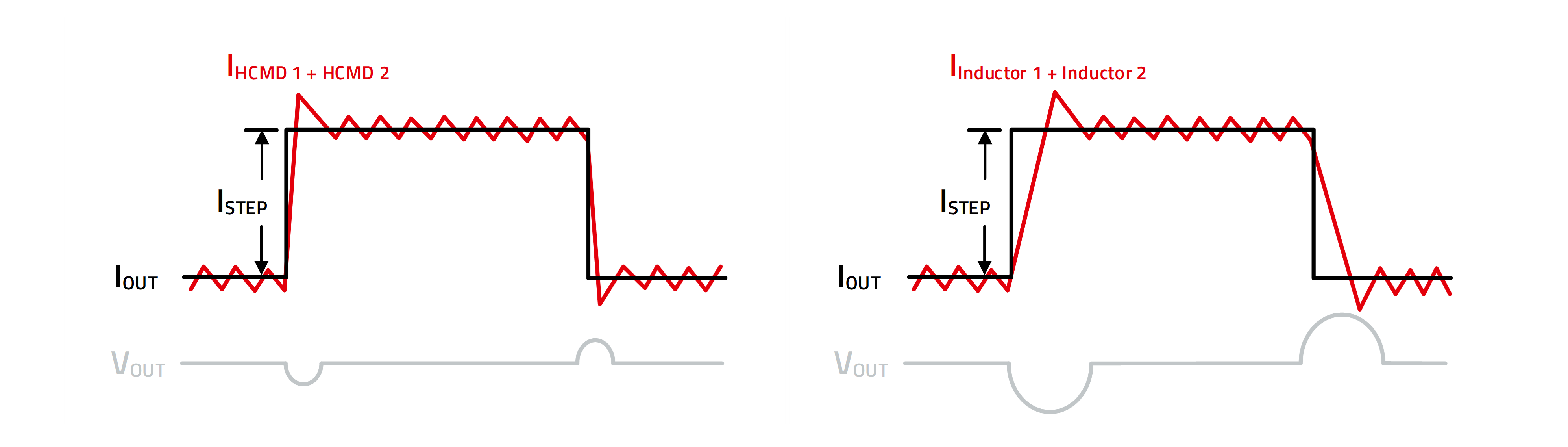 The added secondary winding is the key reason TLVR can achieve high performance in the transient response to a load demand. The secondary loop distributes current dynamically during load transients. The compensating inductor allows for better control of current shared among phases. They sum up to the current used by the load, reducing the peak-to-peak ripple current. This results in a faster transient response and lower voltage drop during load transients compared with a multi-phase DC/DC converter, as shown in Figure 3. This allows for an increased current demand and operating frequency in the application, reducing delays caused by phase interleaving and minimizing voltage overshoot and undershoot during load transients. As a result, voltage regulation is improved and stress on the power components is reduced.