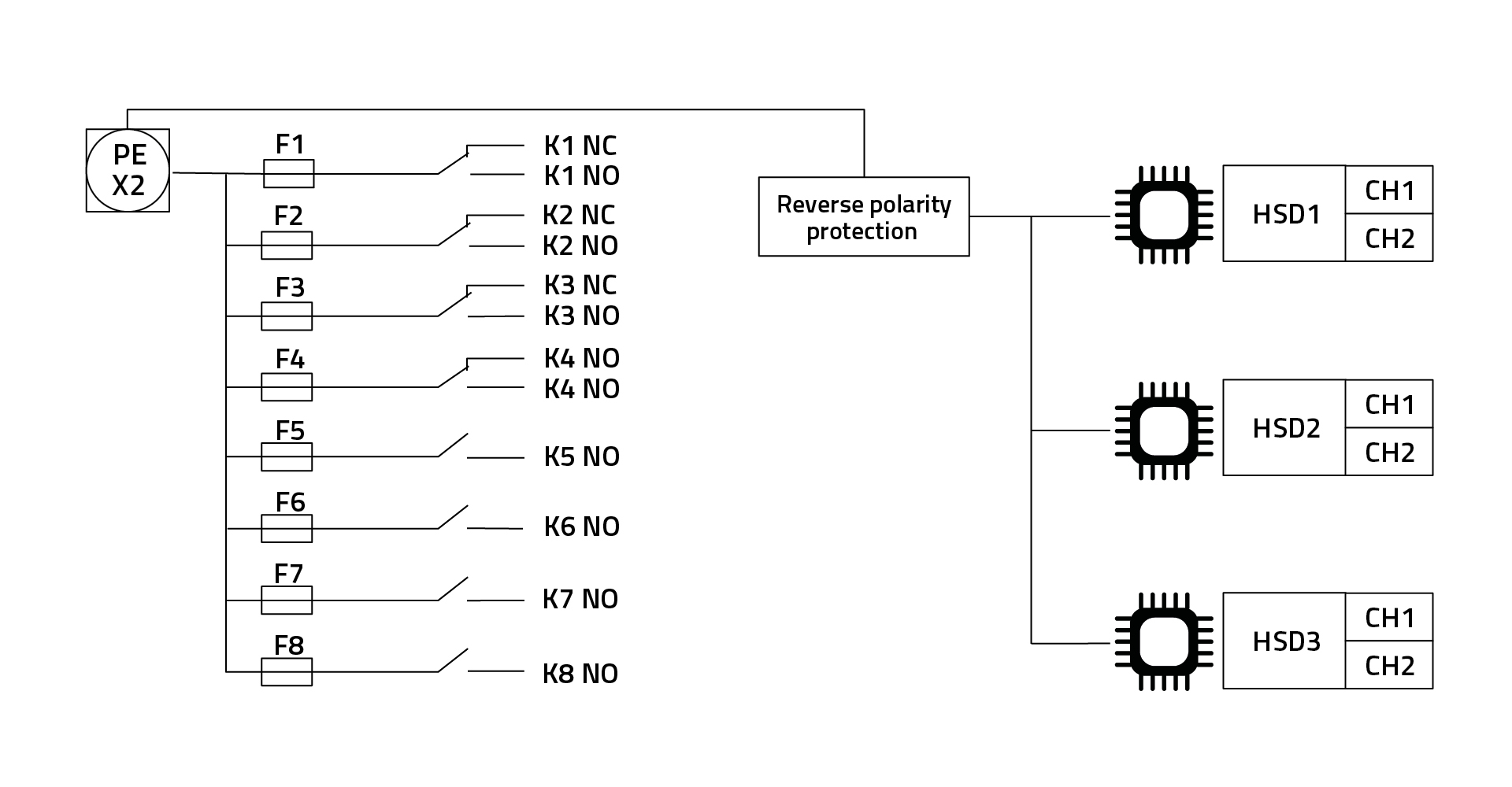 All outputs are equipped with current measurement. The relays provide digital feedback of each output (NO/NC), allowing diagnosis of defective fuses or monitoring of relay status.