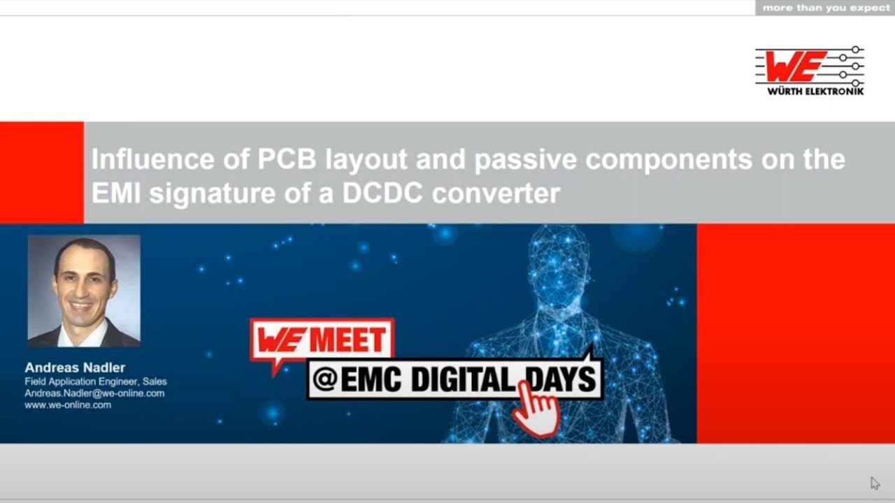 This presentation was part of our virtual conference (25-28 Oct.): WE meet @ EMC Digital Days 2021 Often the success of an EMC test is closely related to the DCDC power supply on boards. This seminar will show the influence of different PCB designs as well as the passive components on the EMC signature using a real measured DCDC converter. In addition, suitable filter strategies will be presented in order to comply with the limits of CISPR32 Class B from 150kHz to 1GHz.