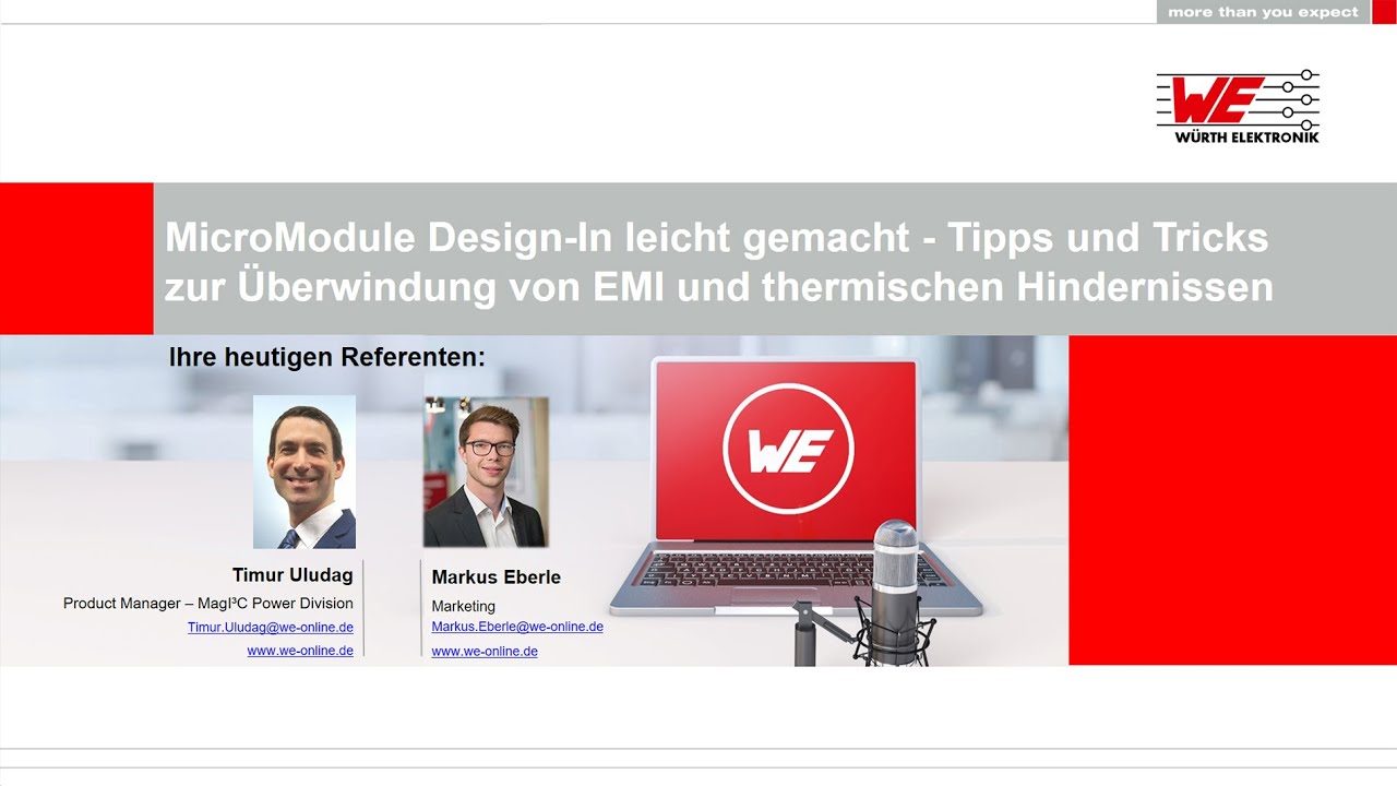 In diesem Webinar wird die Begründung der PCB-Layout-Empfehlungen für MagI³C Power Module erläutert und Schritt für Schritt veranschaulicht. Dazu wird der komplette Layout-Designzyklus am Beispiel der MagI³C MicroModule vorgestellt, beginnend mit den grundlegenden Designregeln und weiterführend mit den fortgeschrittenen anwendungsorientierten Themen der EMV-Minderung und der thermischen Optimierungstechniken. Das thermische Simulationswerkzeug von REDEXPERT wird zusammen mit realen EMV-Messungen, die von Würth Elektronik Ingenieuren durchgeführt wurden, gezeigt, um die Auswirkungen der Einhaltung dieser Layout-Richtlinien empirisch zu demonstrieren.